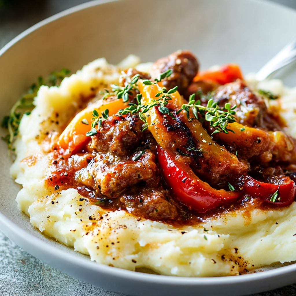 Creamy Sausage and Peppers over Mashed Potatoes is a comforting, flavorful dish featuring savory sausage in a rich cream sauce served over fluffy mashed potatoes—perfect for any weeknight dinner!