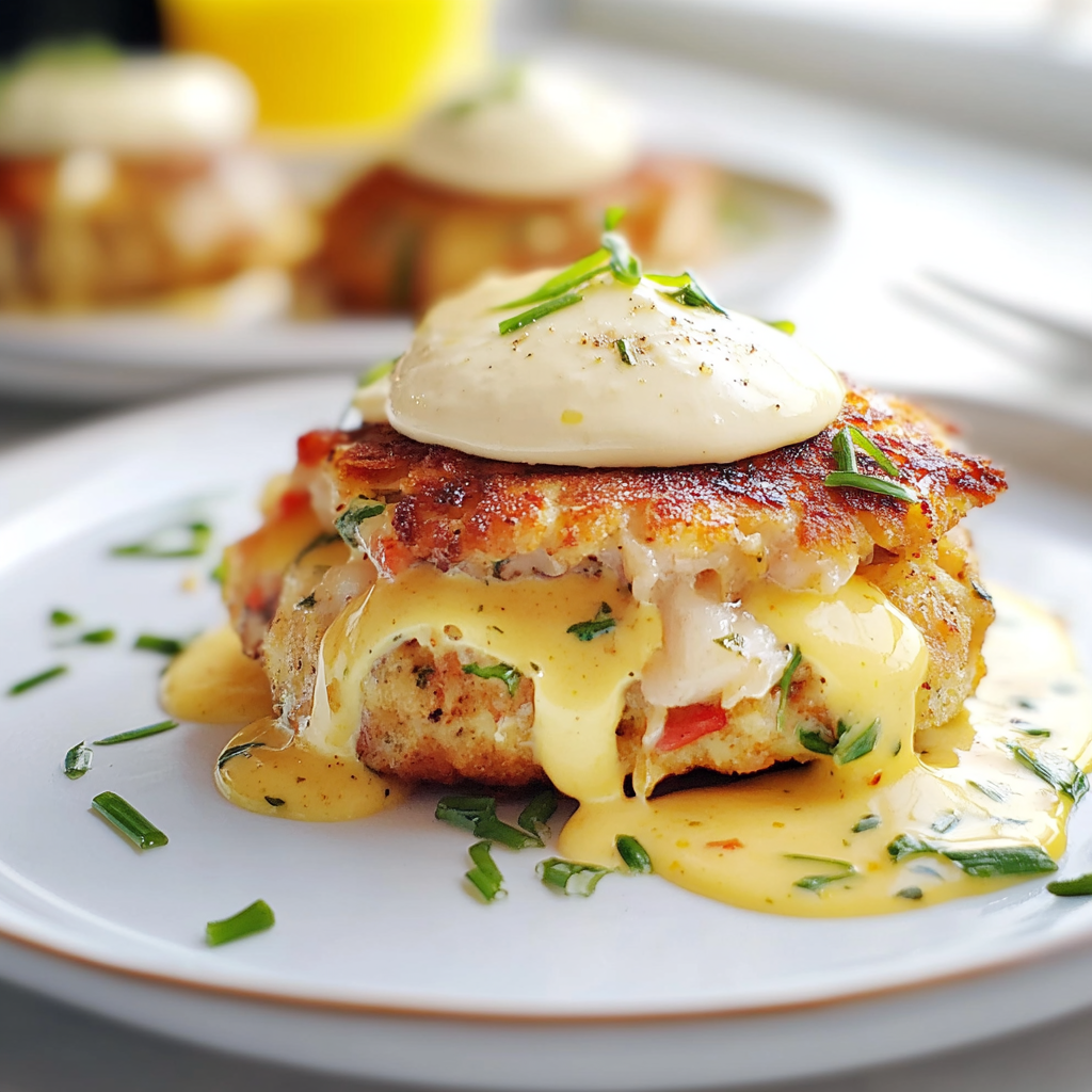 Assembling Your Dish: Start by placing two crispy crab cakes on each plate. Top each one with a perfectly poached egg followed by generous spoonfuls of hollandaise sauce. Garnish with extra parsley if you’re feeling fancy