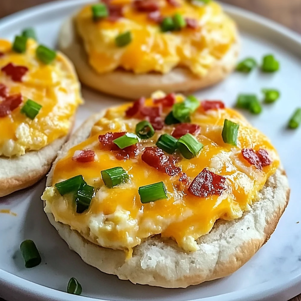 Add Toppings: On each muffin half, layer shredded cheese as a base. Follow with sautéed veggies, crumbled bacon or sausage, and crack an egg on top of each one if you’re feeling adventurous.