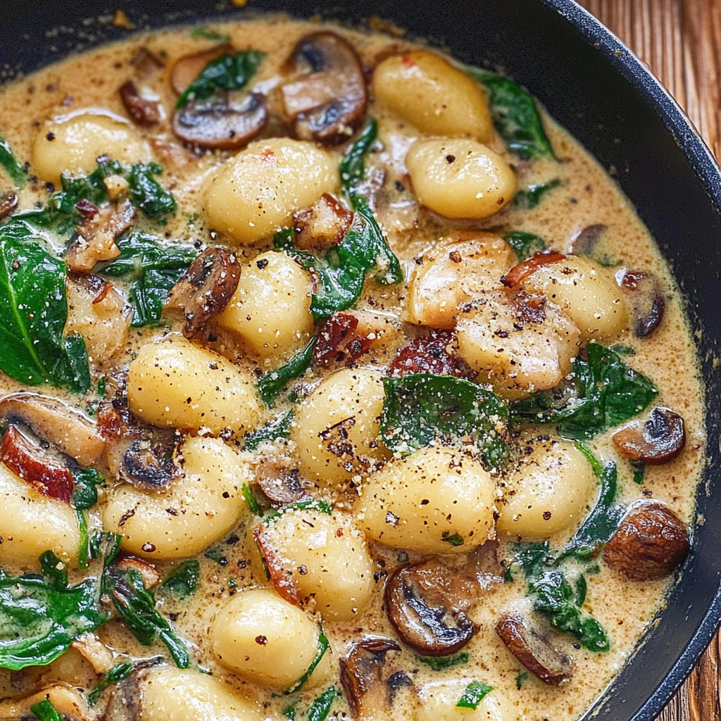Creamy Spinach and Mushroom Gnocchi is a comforting, indulgent dish that combines tender potato gnocchi with a rich, velvety sauce made from fresh spinach, earthy mushrooms, and Parmesan cheese. This easy-to-make recipe is perfect for weeknight dinners or special gatherings, delivering warmth and satisfaction in every bite. With its vibrant colors and delectable flavors, this dish is sure to become a family favorite!