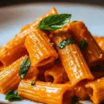Toss in Pasta and Serve: Add cooked rigatoni directly into the creamy tomato sauce. Toss everything together until coated evenly. Remove from heat, garnish with fresh basil and grated Parmesan cheese before serving.