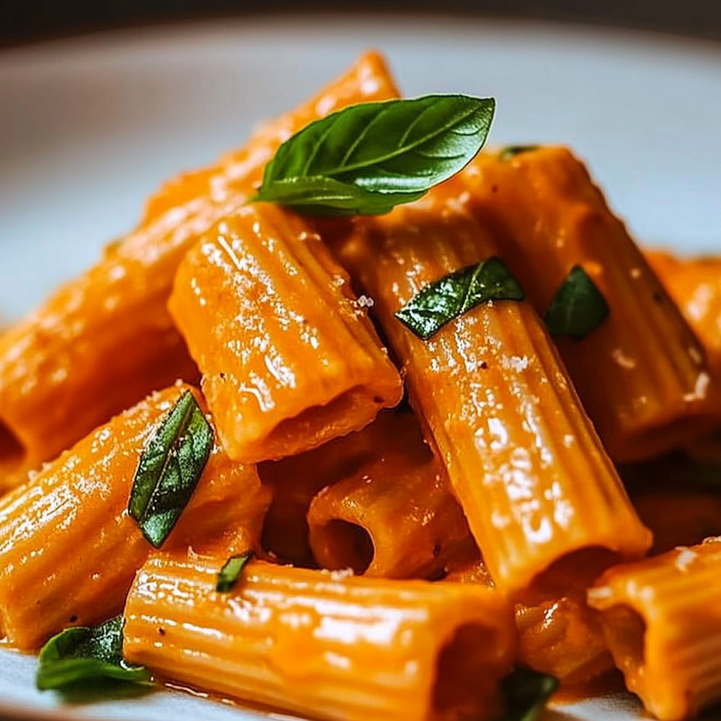 - Toss cooked rigatoni into the sauce until well coated. Serve garnished with fresh basil and Parmesan.