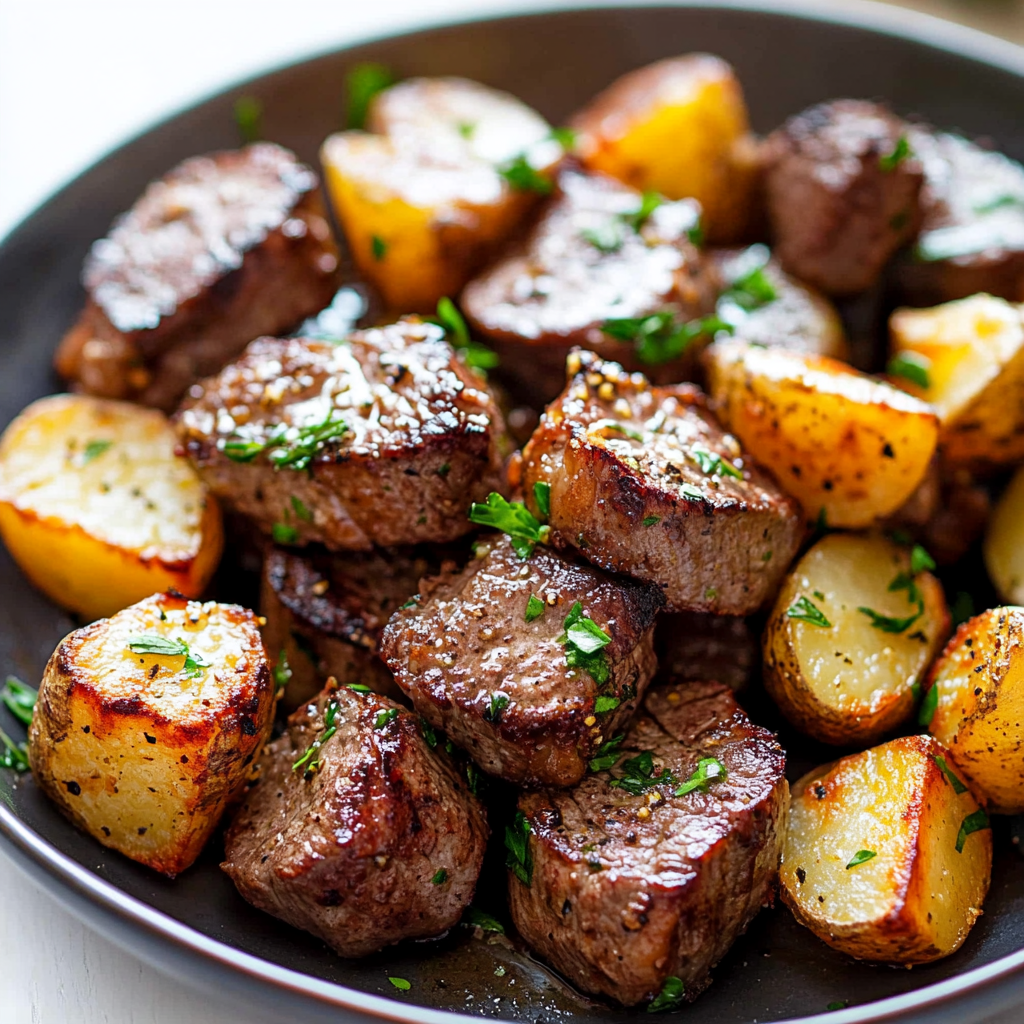 Sear the steak bites in a hot pan first for that perfect crust, then add the garlic butter and toss in the crispy potatoes until golden brown.