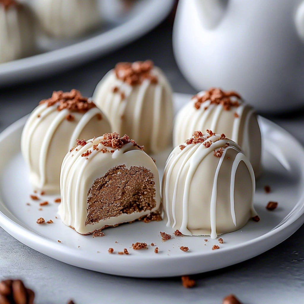 Start by crushing gingerbread cookies into fine crumbs. Then, mix in cream cheese and spices before rolling into balls and coating with melted white chocolate for the best results.