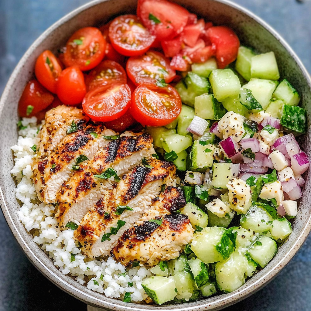 A Greek chicken bowl combines grilled chicken with fresh vegetables, grains, and tangy dressings.