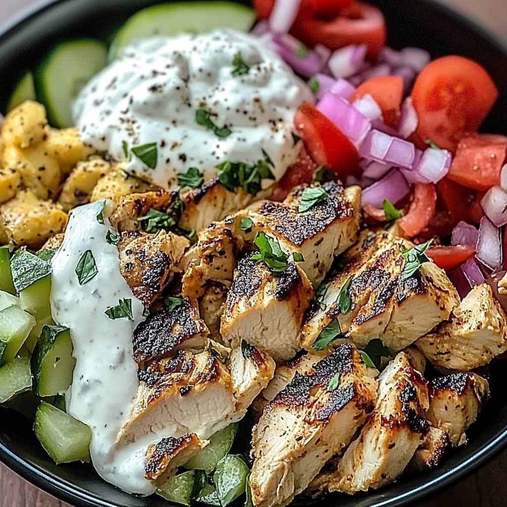 Assemble Your Bowls: Slice cooked chicken into strips. In bowls or plates, layer rice or pita as your base. Top with sliced chicken, diced cucumbers, red onion slices, crumbled feta cheese, and generous dollops of tzatziki sauce.