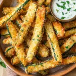 Store leftover zucchini fries in an airtight container in the fridge for up to three days. To reheat, place them on a baking sheet at 375°F for about 10 minutes to regain their crispiness.