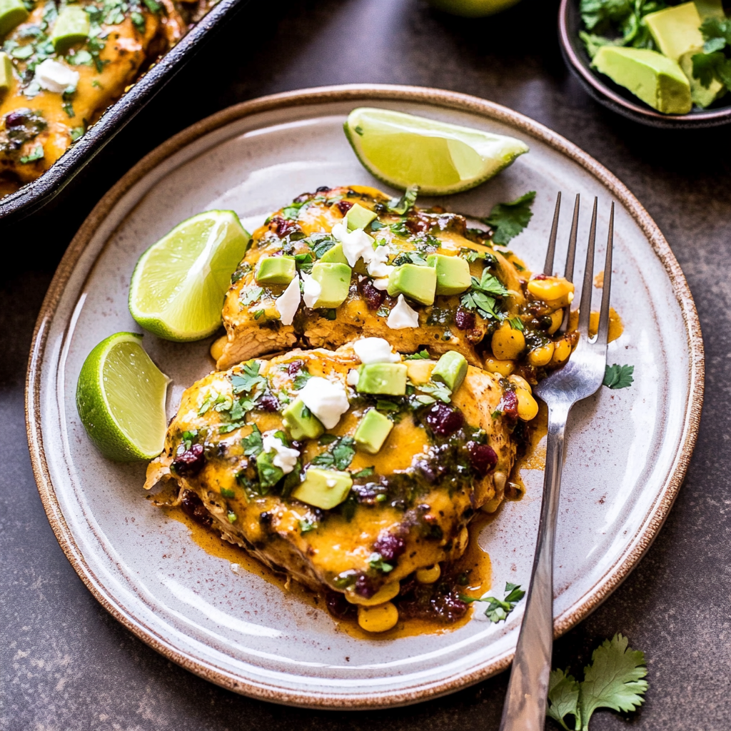 Squeeze fresh lime juice over the top for an extra zing! It complements the salsa verde perfectly and gives your dish that pop of flavor. Place the baking dish in the oven and bake for about 25-30 minutes or until the chicken reaches an internal temperature of 165°F (74°C). You’ll know it’s done when it looks golden brown and delicious!