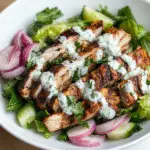 Assembling your salad: Once cooled slightly after cooking, slice the chicken into strips. Place over a bed of greens—think mixed lettuce or spinach—and drizzle with generous amounts of yogurt sauce.